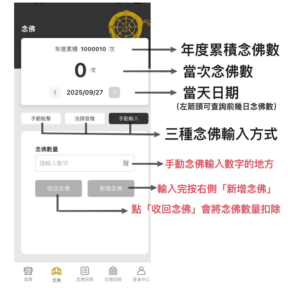 右側「⼿動輸入」:⾃⾏輸入念佛數後按「新增念佛」, 若輸入錯誤可按「收回念佛」,就可以直接扣除。