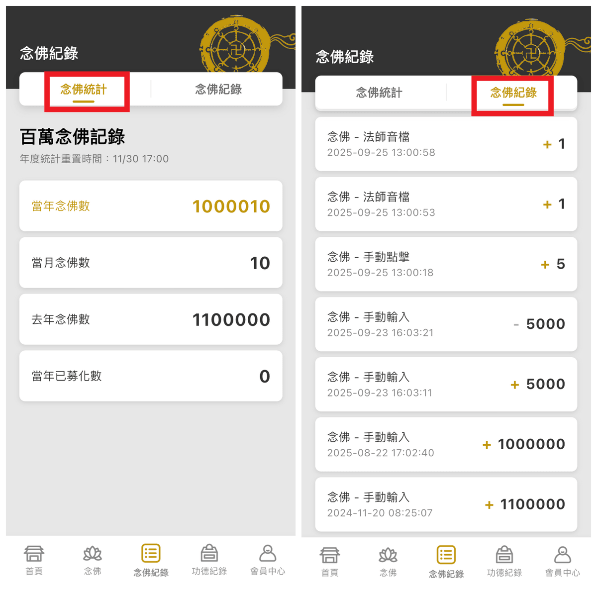 點選右側「念佛統計」可以看到每一次輸入及扣除的念佛數,並且每一筆都有日期和時間。